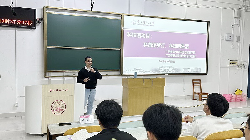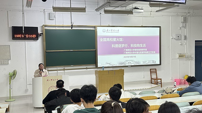 正值金秋十月,恰逢全国高校星火馆与科技活动月同步推进,一场关于“超级细菌”微观奥秘与“逐梦高手”成长攻略的讲座,将碰撞出怎样的思维火花?2025年10月27日晚上,由广西师范大学绿色地球探究馆与环境与资源学院教立方协会联合主办的“科普逐梦行,科技向生活”主题讲座在雁山校区成功举行。本次活动由我室蒋瑜副教授、卢宇翔讲师主讲,陈朝述高级实验师主持,面向学院2024级和2025级本科生,以讲座的形式,带来一场知识与梦想的盛宴。